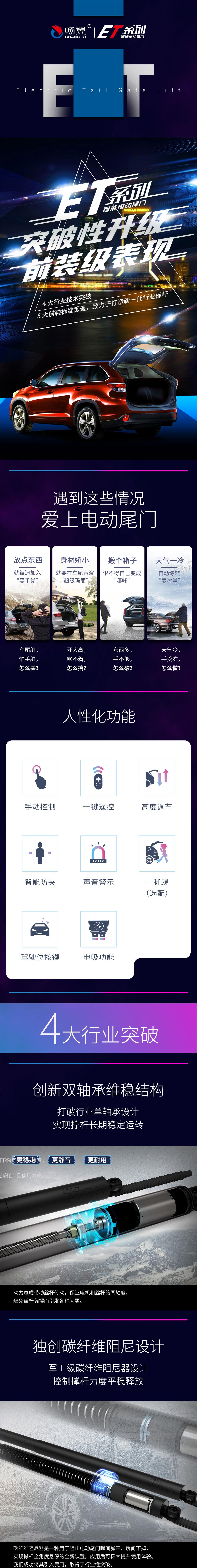 畅翼臻系列马自达CX-5电动尾门适配2013款+,除了撑杆、控制盒等产品部件的全面升级,以及噪音值的再次优化,超低静音运转,真电吸平缓开闭。另外也提供了智能防夹压条、一脚踢等组件的选配,为广大车主提供更高档、更多元化的选择。